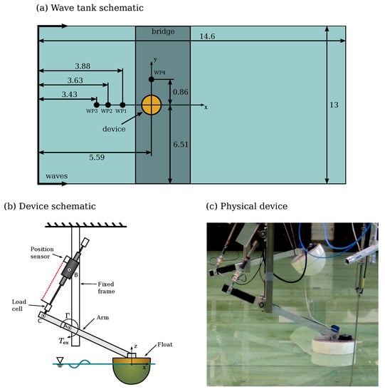 Schematic (not at scale) of the physical wave tank including the wave probe (WP) positions (all dimensions in [m]) (a) and the device (b). (c) shows a photograph of the physical device.