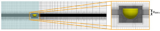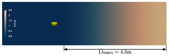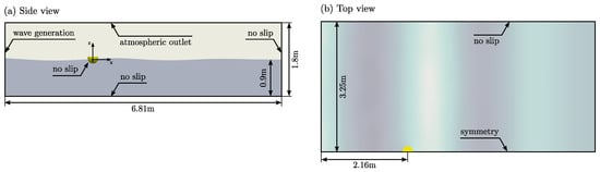 The same computational domain is used for all the different test cases. Figure 3a,b show the side and top view of the numerical domain, including all relevant dimensions, respectively. To reduce the overall cell count, the symmetry of the problem is exploited and only half of the physical wave tank is modelled numerically. A symmetry boundary condition is employed in the -plane, where x points in the wave propagation direction, and z away from the tank floor (see Figure 3a). Furthermore, the width of the NWT is reduced and the distance between the wave generation boundary and the device location is shortened, compared to the physical wave tank.