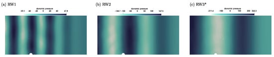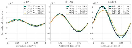 As indicated in Figure 5a–c, more inconsistencies can be observed for the wave heights between the different wave probes. Specifically for wave RW3, significant discrepancies between the measured free surface elevation at wave probe WP1–WP3 ( m) and WP4 ( m) are found. Based on the increased spread between the wave probes, with increased wave height and period, it can be assumed that the observed behaviour stems from the influence of wave reflections due to the absorption capabilities of the physical wave tank.