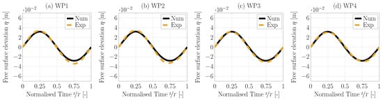 Generally, a relatively good match in phase can be observed for all waves at all wave probes in Figure 6, Figure 7 and Figure 8. Furthermore, Figure 6, Figure 7 and Figure 8 reveal a consistent wave field within the CFD-based NWT for all waves, with negligible differences between the wave probes. The consistency in the wave field can be expected due to the excellent absorption capabilities achieved with the numerical beach, with reflection coefficient below 2% (see Appendix A). The difference in consistency of the experimental and numerical wave field leads to varying agreement between the experimental and numerical data (see Table 4), with a maximum deviation of (RW1 at WP3). This varying agreement has to be taken into account for any further comparison between the experimental and numerical data.