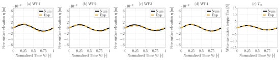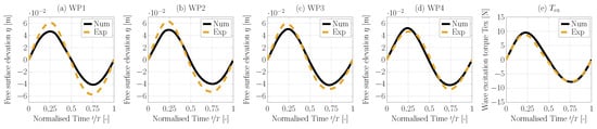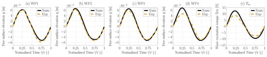 Figure 9, Figure 10 and Figure 11 show the results of the phase averaged wave excitation torque , as well as the free surface elevation, measured at wave probes WP1–WP4. For a quantitative comparison, Table 5 lists the nRMSD between the experimental and numerical data. Note that the experimental excitation torque magnitude is used for the normalisation of the wave excitation torque RMSD.