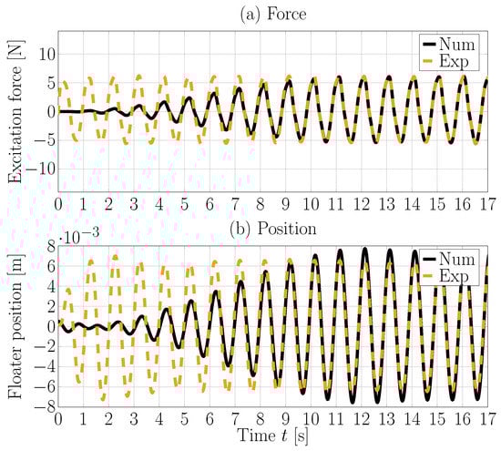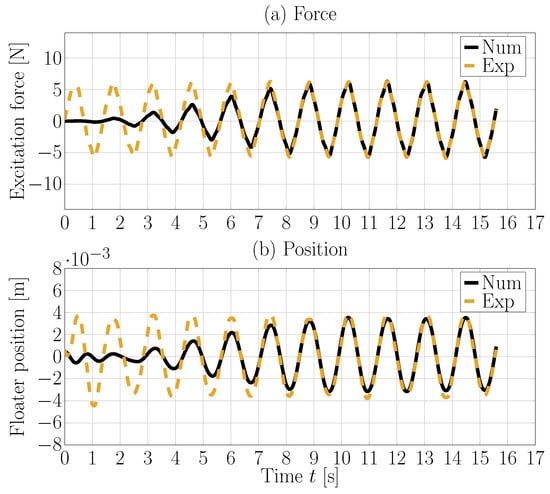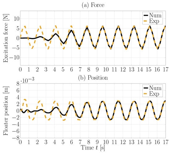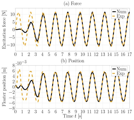 Figure 18a,b show the experimental and numerical time traces of the single-frequency excitation force (with a frequency of 1.01 Hz and an amplitude of 5 N) and the resulting floater position, respectively. It can readily be seen that the excitation close to the resonance frequency of the device (see Section 5.3) leads to considerably larger floater motion, compared to the excitation at 0.54 or 0.71 Hz. Consequently, the larger floater motion leads to larger free surface perturbation, potentially influencing the system through wave reflection within the physical wave tank. Potential wave reflection together with the artefacts of the mechanical system, suggested by the previous results, lead to relatively large differences between consecutive periods in the experimental data and, thus, to relatively large differences between the experimental and numerical results.