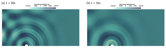 Inspecting the free surface perturbation in the CFD-based NWT at s (see Figure 20a), the differences between the numerical and experimental floater position between 24.5 27 can be attributed to the influence of reflected waves from the domain boundaries and the different reflection behaviour in the physical and numerical wave tanks. However, inspecting the free surface perturbation at s (see Figure 20b) significantly smaller free surface perturbations can be observed in the CFD-based NWT. This suggests that the differences in the floater position amplitude between 20 22 may stem from mechanical features of the physical system, which are not captured in the CFD-based NWT.
