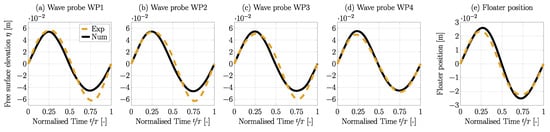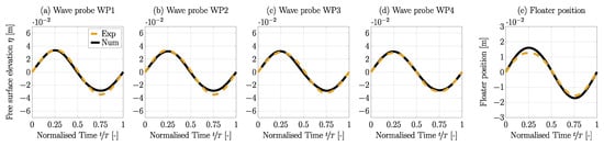 Finally, cases of wave-induced WEC motion are considered for validation of the numerical 1/20th scale Wavestar model. Figure 21, Figure 22 and Figure 23 show the phase averaged experimental and numerical free surface elevation at WP1–WP4, as well as the phase averaged floater position. The relevant values of the nRMSD are listed in Table 6. The target wave height and the experimental peak to trough magnitude of the floater position is used for normalisation of the RMSD for the free surface elevation and the floater position, respectively.