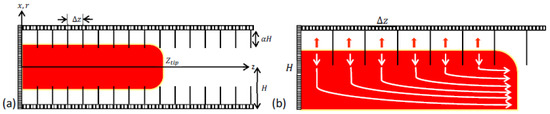 With methane-air and propane-air laminar burning velocities not exceeding [24] and the respective speeds of sound circa , the initial Mach number associated with flame propagation appears to be very small, . This guides us to employ a low Mach number model of an incompressible flow, , similar to [3]. This model has been widely employed analytically and verified by fully compressible computational simulations in our previous works [4,15]. The model has been justified to work well at the initial, essentially subsonic stage of flame acceleration, and to provide reasonable evaluations even in the case of compressible flows. Nevertheless, it is recognized that the model would break when the burning velocity approaches near-sonic values. Such a limitation of the model and the way to overcome is commented on in Section 3.1. For a 2D geometry, the incompressible continuity equation reads as: