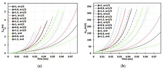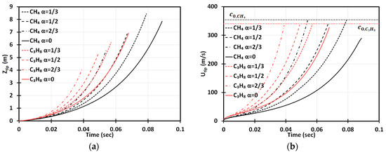 We also determine the flame run-up time, , which we evaluate as the time at which the flame velocity reaches the speed of sound of the reactants, . Namely, Equation (17) gives the run-up time as: