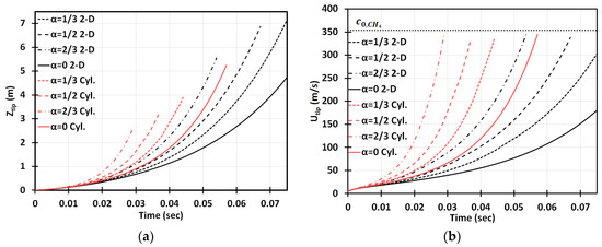 Figure 3 is a counterpart of Figure 2 for the cylindrical geometry. It is seen that the flame accelerates faster in this case. Opposite to the situation of and methane-air burning in a 2D geometry, here, at the same conditions, the flame would overcome the sound speed at , i.e., slightly prior the deceleration stage starting at . To demonstrate this more clearly, in Figure 4 we have compared the results obtained in the 2D and cylindrical-axisymmetric geometries. Overall, Figure 2, Figure 3 and Figure 4 show that the obstacles influence a coal mine fire scenario significantly, making acceleration potentially unlimited in contrast to the case of no obstacles, which was considered in [3]. In addition, flame acceleration in Figure 2, Figure 3 and Figure 4 exceeds that of the original theories [14,15] by orders of magnitude, thereby certifying that the DL instability facilitates obstacle-based acceleration.