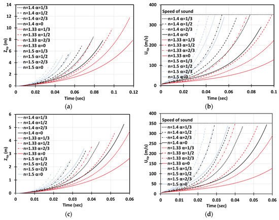 We have considered in the range and scrutinized its impact on the present formulation. Specifically, Figure 5 compares the time evolutions of the flame tip positions (a, c) and velocities (b, d) for stoichiometric methane-air burning considering , and both 2D (Figure 5a,b) and cylindrical (Figure 5c,d), geometries are studied. It is seen that the variations of impact the flame position, velocity and acceleration substantially, although the effect is quantitative but not qualitative. As expected, flame acceleration in the case of proceeds noticeably faster than for , whereas a flame with accelerates noticeably slower as compared with that with (of course, provided that other combustion characteristics are kept the same). Nevertheless, without the final answer to the question about an appropriate choice for , in the rest of this work we keep using its median value, , the same as that in the unobstructed theories [3]. This allow us to make a comparison with [3], thereby separating the impact of obstacles.