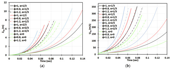 It should be mentioned that everywhere except for Figure 5 we employed the exponent of Equation (1) to be the same as that in [3], i.e., . This is in order to compare the present work with the “unobstructed burning accident” theories [3] (as well as with the original Bychkov theories [14,15], which did not consider the DL instability, thereby having by default). It is noted, in this respect, that an appropriate choice of the factor is not yet finalized. Indeed, while various experimental studies such as Gostintsev et al. [18], Bradley et al. [19], Molkov et al. [20], Kim et al. [21] have reported , the Princeton experiments in a dual chamber at elevated pressures suggested ; see Jomaas et al. [22] and numerous references therein. The theoretical work [30] has provided an attempt to explain such a discrepancy between various experiments by the flame-acoustic coupling, which modifies . Moreover, the quantity of can also be potentially modified by turbulence and other combustion instability modes such as Rayleigh–Taylor instability (assuming that the general trend of Equation (1) remains).