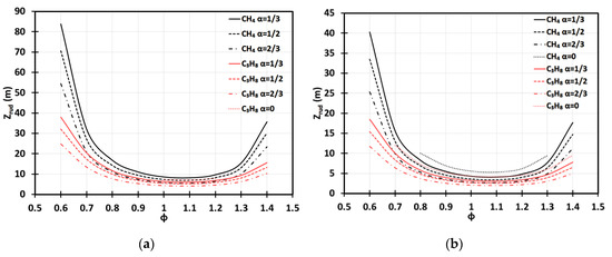 Using Table 1, we next analyze the run-up times , Equations (18) and (34), and the respective run-up distances , Equations (19) and (35), for the methane (CH4)-air and propane (C3H8)-air flames of various equivalence ratios. Specifically, Figure 10 presents versus for various blockage ratios, including the case of no obstacles, , in the 2D (Figure 10a) and cylindrical (Figure 10b) geometries. Overall, Figure 10 agrees with our analysis above in that the shortest run-up distances are observed for a slightly fuel-rich methane-air flame of . In the 2D case, Figure 10a, we have , , and for , respectively. The case of in a 2D geometry is not relevant because a flame skirt contacts a sidewall and stops accelerating before the DDT event for all considered, which is in line with the findings of [3]. For the lean or rich methane-air flames, the run-up distances are much higher, namely, up to for and up to for (still in the 2D geometry). In the cylindrical-axisymmetric configuration, for the fastest methane-air flames with we found the run-up distances as small as , , , and for , respectively. For lean or rich methane-air burning, the run-up distances are much higher in the cylindrical geometry, i.e., up to for and up to for . It is noted that, unlike the 2D configuration, in the cylindrical-axisymmetric case, the detonation is predicted for methane-air burning even in the case of , when the equivalence ratio is in the range , which generally agrees with [3]. Overall, for the same geometry, and , the run-up distances are dramatically shorter for the C3H8-air flames as compared with the CH4-air flames; this would overcome the sound threshold for additional equivalence ratios in the case of , being within the ranges and for the 2D and cylindrical-axisymmetric geometries, respectively.