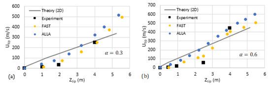 Comparison of our theoretical formulation with the experiments [31] and computational simulations [6] (FAST, yellow, and ALLA, blue). The flame tip velocity vs. its position for the blockage ratios (a) and (b).