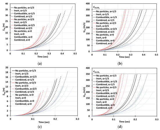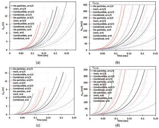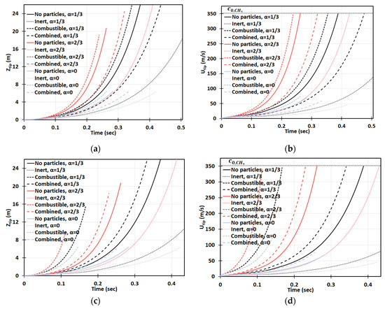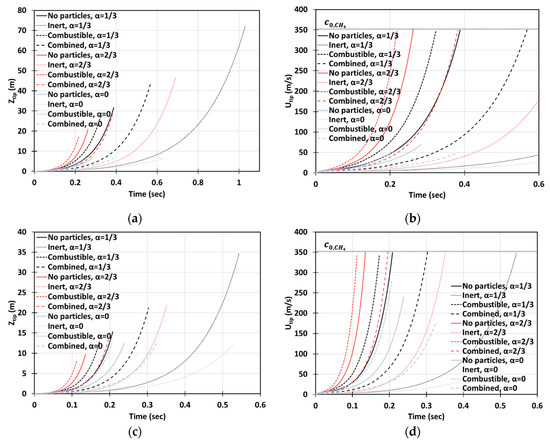Figure 13 depicts the situation of gaseous-dusty combustion, with the dust of concentration and of dust particles radius in the 2D (a, b) and cylindrical-axisymmetric (c, d) geometries. We employed the lean () methane-air fuel mixture and various blockage ratios , including the case of no obstacles, . It is seen that combined (combustible + inert) and inert dust moderate flame acceleration, whereas combustible particles slightly facilitate flame propagation. The effect of obstacles is also noticeable (as compare with an unobstructed passage).