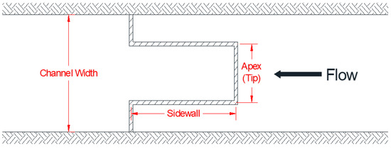 The factors that govern the performance of labyrinth weirs are discharge, head, and weir geometry [7,12]. The factors that control the weir geometry are the total crest length of the weir (effective crest length), LC; cycle width, w; sidewall angle, α; upstream wall height, P; downstream wall height, D; wall thickness, T; crest shape; and weir apex shape (apex configuration or weir tips shape) that is horizontally normal to the flow direction [2,5,12].