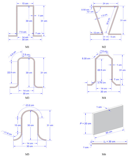 To study the effects of corner shapes on the discharge coefficient of labyrinth weirs, six experimental models, fabricated from High-Density Polyethylene Plastic (HDPE) with 1 cm thickness, were installed in a laboratory flume at the University of Sulaimani. Figure 2 shows a photograph of the experimental setup (S6MKII—Teaching and research flume—manufactured by Armfield company) that comprised an inlet tank, main channel, outlet tank, reservoir tanks, pump, pipes and valves, and flowmeter. The length, width, and height of the main channel were 5 m, 0.3 m, and 0.45 m, respectively. The models were placed at the mid-length of a zero-slope steel bed flume with Plexiglas sidewalls. The flat crest shape rectangular labyrinth weir models (five models) were placed in the flume in an inverse orientation and tested without an artificial aeration device. Figure 2 and Figure 3 and Table 1 present the details of the models studied in this research.
