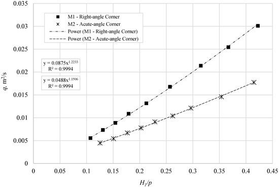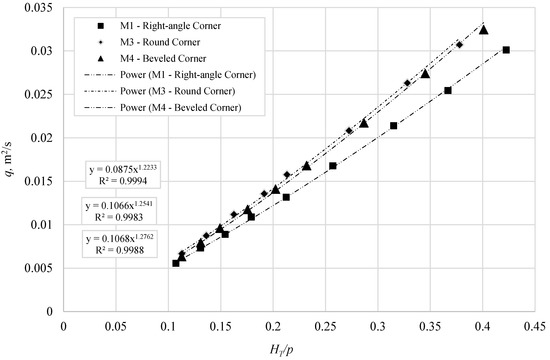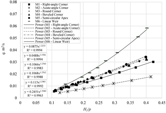 To quantify the experimental results, a regression analysis was performed between the unit discharge over the weirs, q, and the HT/P values. The best-fitting correlation shows the power trend as follows:
