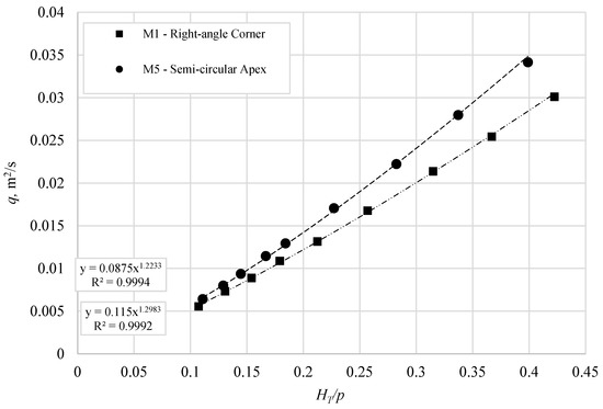 From Figure 6 and Table 3, although its effective length (LC) decreased by 14%, the unit discharge (q) over the M5 model, compared to the M1 model, increased by 19% on average; the range of increase in the q values was 14.5–24.4%. This finding is in agreement with the literature [9] that compared a U-shape labyrinth weir to a rectangle shape labyrinth weir and found that the U-shape labyrinth weir had a higher discharge coefficient.