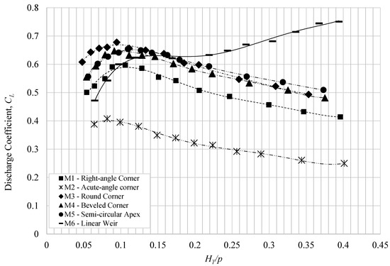 From the results depicted in Figure 9, the variation of CL values could be divided into three parts. For small discharges, HT/P < 0.1, the CL values for the labyrinth weirs (M1, M2, M3, M4, and M5) were higher than those of the linear weir (M6). While for HT/P > 0.17, the CL values for the linear weir (M6) were higher than those of the labyrinth weirs (M1, M2, M3, M4, and M5). This can be attributed to the fact that the labyrinth weirs typically create larger headwater inflation, compared to the linear weirs. This, in turn, leads to an early reduction in CL values for labyrinth weirs at small discharges, for HT/P < 0.1 [4,10]. However, for small discharges (HT/P < 0.17), due to the longer effective length of the labyrinth weirs (LC), the effect of the headwater inflation was smaller for rectangular labyrinth weirs compared to the linear weir. As discharge increased at a higher head (HT/P > 0.17), due to headwater inflation, as well as nappe interaction and interferences, the CL values for the linear weir were higher than those for rectangular labyrinth weirs. The decrease in CL values for labyrinth weirs occurs due to the nappe interaction, which increases as discharge increases [10].
