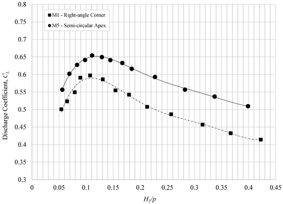 The apex shape of the labyrinth weir was effective as well. For the labyrinth weir with a semi-circular shape (M5 model), although the original effective length reduced by 14%, the CL values increased by 16.7 on average; the CL values increased by 9.9% to 22.8%, see Table 4 and Figure 11.