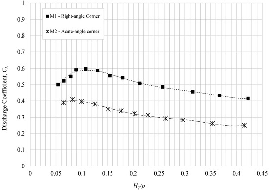 The results of the experiments show that the corner shape has significant effects on the discharge coefficients of the rectangular labyrinth weirs. For the discharge range used in this study, although the effective length of the models (LC) used in this study decreased, except for the M2 model, the values of CL for some models increased significantly. On the contrary, the values of CL for the M2 model decreased significantly, even though the effective length of the model was larger compared to the length of the M1 model. Furthermore, the CL values of the M1 model were smaller than those of the models having either round corners (M3 model) or beveled corners (M4 model). Figure 9, Figure 10, Figure 11 and Figure 12 show the values of CL for the models that are plotted as a function of HT/P ratios. As depicted, the results showed that the values of CL for the labyrinth models increased with an increasing HT/P ratio until a specific value of HT/P, after which a constant decrease in CL value occurred.