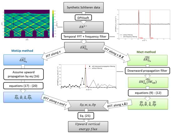 Schematic chart of the Mxzt and MxtUp methods for calculating the density anomaly and the upward vertical energy flux from synthetic Schlieren data. * When applied to internal wave fields observed in the laboratory experiments (Section 3.2), a moving mean is applied along the z axis to the experimental data () in order to reduce the small-scale noise.