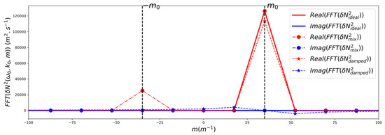 The first step in determining from with the method Mxzt is to calculate the Fourier transform by FFT. Particular slices (for given values of and ) of the resulting 3D spectra for the three analytic fields are compared in Figure 2. The spectrum of (plain lines) is zero everywhere except at the fundamental vertical wavenumber . The spectral amplitude of (dashed lines) is slightly smaller at than that of , and the imaginary part of also shows peaks at and . These “artificial” harmonics in the spectrum of are caused by the non-periodicity of the IWdamped signal. The non-periodic signal is seen as a periodic discontinuous signal by the FFT, and the discontinuity distorts the spectrum by adding false overtones that are aliased into the spectrum. The figure also shows the spectrum of (dashed-dotted lines with circle markers). The real part has an additional peak at , which is the signature of the downward propagating beam (IWdown).