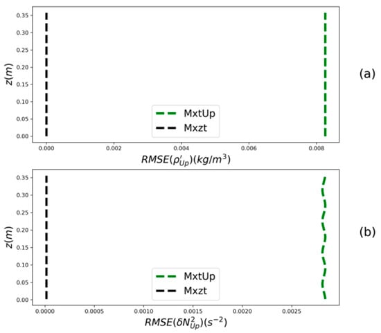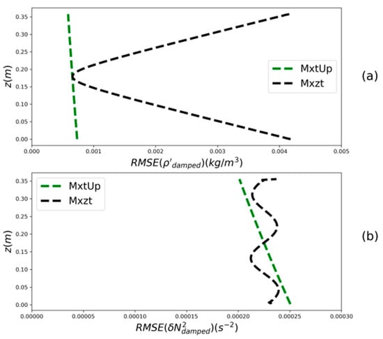 The reconstructed field is obtained from the vertical derivative of the reconstructed field , using Equation (7). The normalized rms differences over the entire domain between the original and the reconstructed from the Mxzt and MxtUp methods are both 1.8%. Thus, for the Mxzt method, the error of the reconstructed field () is smaller than that of the reconstructed field (. Figure 3b compares the vertical profiles of the rms error of averaged over and for both Mxzt and MxtUp. For Mxzt (dashed black line), the rmse vertical profile presents several oscillations related to Gibb’s oscillation phenomenon.