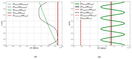 (a) The vertical energy flux for IWdamped (dashed curves) and IWideal (plain curves) resulting from the MxtUp (green curves) and Mxzt (black curves) methods. The red curve represents the analytic vertical energy flux for IWideal, as defined by Equation (32). (b) Vertical energy flux for IWmix, obtained with MxtUp (green curve) and Mxzt (black curves); analytic flux in red, as defined by Equation (32). Plain curves are upward and dashed curves are downward flux. The black dotted line shows the total flux (upward minus downward) obtained with Mxzt and the combined field IWmix.