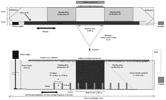 The experiments were conducted in the flume used as a 22-m-long, 3-m-wide, and 1-m-high closed glass tank. A glass wall divided the tank into two parts, respectively 0.5 m and 2.5 m wide (Figure 6). The ridges were towed in the narrow part of the tank, while the wide part was used to dampen waves propagating horizontally from the two ends of the narrow part. Those waves were reflected into the wider part of the tank by deflectors covered with wave-damping material. The waves were then attenuated along sloping plates also covered with wave-damping material.