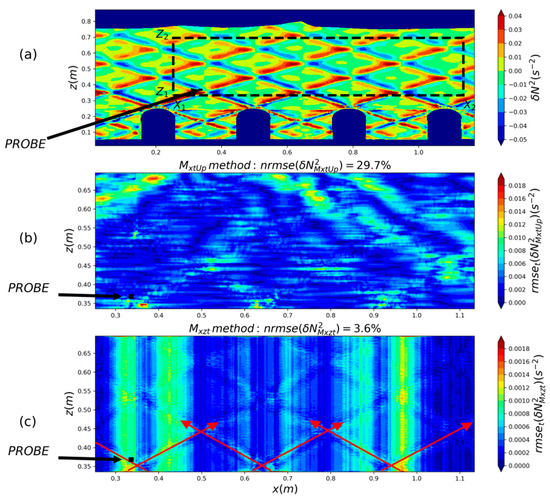 For both methods, the errors are larger near the beams. This is expected, since the rms errors are not normalized by the local amplitude. Judging from the analytic examples, we should use the MxtUp method, since in the experimental data, the periodicity is much better along x than along z. However, the global and normalized rms difference between and is more than , wheras it is only 3.6% between and . Mxzt therefore seems to be the most accurate method. To understand this result, we take a closer look at the differences between the MxtUp and Mxzt reconstructed Brunt–Väisälä frequency anomaly fields.