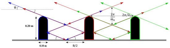 The forcing frequency determines the IW beam angle, , and thus influences the reflection point on the neighboring obstacle and on the ground. Hence, the interference between the IW beams is determined by the forcing frequency ω and by the distance B between two ridges. Several IW beam angles can lead to constructive interference, depending on the number of reflections of the IW beams. For the first resonance, there is only one reflection, on the ground, and the downward propagating beam is inclined 58.7° to the horizontal. For the second resonance (illustrated in Figure 8), there are three reflections, two at ridges and one on the ground, and the downward propagating beam is inclined 30.7° to the horizontal. For some forcing frequency between the first two resonances, the downward propagating IWs beams are reflected in the corner between the ridge and the ground. In this case, the interference between the beams is destructive and the energy is trapped between the ridges.