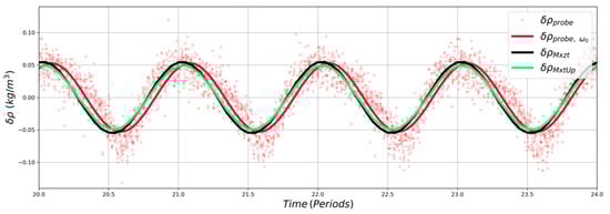 Density measurement filtered at the fundamental frequency ω0 (red curve) and estimation (black and green curves) of the density anomaly from synthetic Schlieren using our two methods. Measurements are taken at a location (black square on Figure 7) in the middle of an upward propagating ray. The red crosses represent the raw probe data.