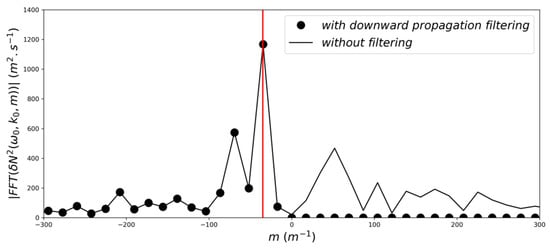 Spectrum of as a function of for and . The plain line represents the spectrum of the raw data () whereas the dotted line represents the spectrum of the filtered data (without the downward propagation). The red vertical line indicates the value of m0.