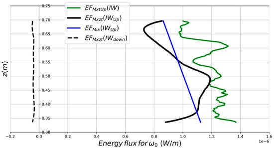 The Mxzt downward EF (black dashed line) also presents Gibb’s oscillations related to the non-periodicity of the IW field in z. The ratio of the downward flux to the upward flux is around 4%.