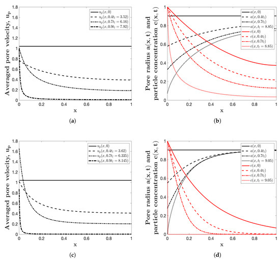 The main results are shown in Figure 3: we simulate the model for the uniform initial profiles , with parameters , and . The Péclet number is chosen to be 2, which describes the ratio of advective to diffusive transport rates. Please note that when , we only consider the effect of particle advection. Figure 3a,c show the cross-sectionally averaged pore velocity (when and respectively), while Figure 3b,d show the pore radius and the concentration of small particles at various times up to the final blocking time (when and respectively). A notable striking feature of these plots is that the pore shrinks at a higher rate at the pore inlet than outlet, and the pore closure occurs first at the upstream membrane surface. This is consistent with the plot regarding the pore velocity shown in Figure 3a,c. At the beginning of the filtration process, the pore velocity is constant for the uniform channel, but it promptly changes into a non-uniform one, with different pore velocity along the pore depth, representing the effect of continuity (see (15)). The main feature of Figure 3d, where only particle advection is considered (), is that the shrinkage mainly occurs at the pore inlet, more than what shown in Figure 3b, demonstrating a significant change due to diffusion effects in the filtration process. The other consequence of diffusion effects is that more particles escape during the filtration process (see Figure 3b), thus the particle concentration at the pore outlet increases a lot compared to the results shown in Figure 3d, where diffusion has no role there. Furthermore, comparing these two plots describing the shrinkage of pore radius brings us to this conclusion that by considering diffusion effects, the pore shrinks more in a uniform way along the axial direction, noticing that the pore outlet shrinks remarkably compared with that of advection simulation. These changes are also correlated with the model (19) assuming that the speed of radius shrinkage is proportional to particle concentration at depth x, meaning that for larger amount of particle concentration, the pore radius shrinks more.