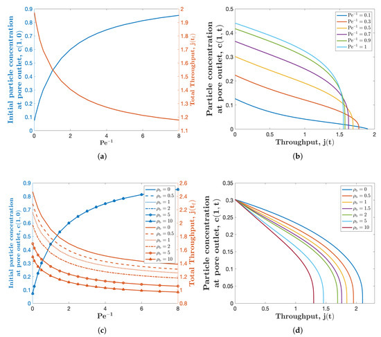 Figure 4b shows the relationship between the particle concentration at the membrane downstream (pore outlet) and the total throughput . Each curve in the figure corresponds to a different value of the inverse of Péclet number , shown in the legend. The intersection of each curve and the y-axis represents the initial particle concentration at the pore outlet. As the filtration process proceeds, the throughput increases and the particle concentration at the pore outlet decreases to zero gradually. Comparing these curves in Figure 4b illustrates that the particle concentration increases as the Péclet number decreases. Meanwhile, as we increase , the total throughput decreases, shown as a smaller intercept with the x-axis. These observations are consistent with the ones shown in Figure 4a. In addition, Figure 4c,d are similar to Figure 4a,c respectively, for several different values of , which characterizes the additional resistance formed when a large particle sits over a pore. Please note that in Figure 4c, is used. The curves with in these two figures, represent the filtration scenario with no large particles included. These curves in Figure 4c,d, collectively show that the initial particle concentration at the pore outlet , does not change with , while the particle concentration at the pore outlet at latter times (, ) and the total throughput both decrease as increases. The effects of large particles on the filtration performance were studied in detail in [21].