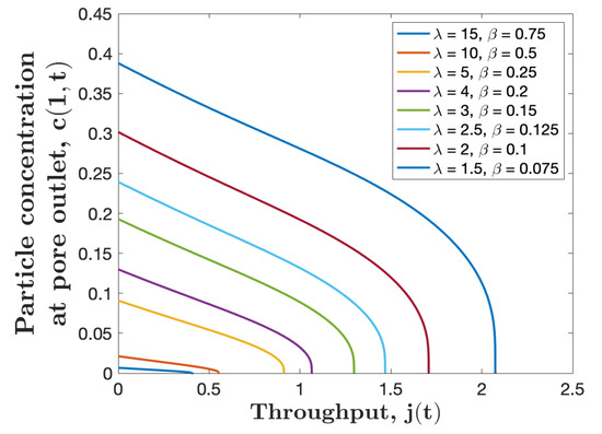From both Figure 4a,b, since the particle concentration at the pore outlet is relatively high compared to the case that only the advection of particles is considered (), membrane properties need to be improved to achieve a superior separation efficiency. We alter two dimensionless parameters: the stickiness coefficient ( ) and the pore shrinkage rate ()), to represent the change of membrane properties. Since and are correlated by the dimensional stickiness coefficient , we keep the relation of while adjusting their values. Please note that the large values of corresponds to strong membrane-particle or particle-particle attraction; hence intuitively this should be employed in filtration application. However, Figure 5 confirms that increasing of results in a low throughput, which is also not desirable. Therefore, the trade-off between a smaller particle concentration or a larger throughput needs to be balanced. As for whether the particle concentration should be the priority or the total throughput should be optimized first, different filtration applications have distinct requirements and cannot be concluded arbitrarily.