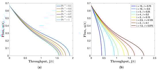 A prevailing characterization of filtration performance is the relationship between the flux and throughput through the membrane. Figure 6a illustrates the so-called flux-throughput graphs for several different values of the inverse of Péclet number . From these plots, we can observe that the total throughput decreases with Péclet number . This can be interpreted that for slow filtration process, less feed solution is processed. As shown, for a fixed total throughput, flux will be less for larger values of . This phenomenon is because that by definition, the flux is directly proportional to the averaged Darcy velocity, which is smaller for larger (consistent with the results of Figure 3). Moreover, each flux-throughput curve in Figure 6a is concave at the beginning and then becomes convex during the last stage of filtration. This change in curvature is consistent with results observed in the experimental systems [32] as well as the model simulations [21].