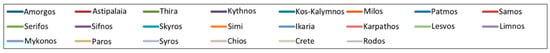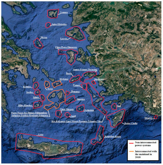 In this connection, the focus was on the non-interconnected Greek islands. The islands of Mykonos, Syros and the former local power system of Paronaxia (consisting of Paros, Antiparos, Folegandros, Ios, Irakleia, Koufonisi, Naxos, Sikinos and Schinousa), which were recently interconnected (end of 2018), were included in the current connection and were analyzed as non-interconnected cases (Figure 1). According to Public Power Utility data [20], in 2016, in non-interconnected Greek islands the electricity consumption was 5571 GWh while the cumulative peak demand was 1230 MW. The maximum electricity demand was reached in 2010, while the electricity consumption over the last six years decreased due to the economic crisis. The cumulative conventional installed capacity in non-interconnected Greek islands was 1714 MW.