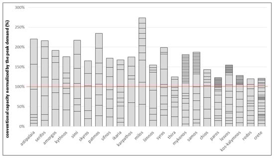 High differences occurred in the normalized conventional capacity among the examined local power systems. On one hand, the normalized conventional capacity covered 120–150% of the peak in some large systems such as Crete, Rodos, Kos-Kalymnos, Thira, Paros and Chios. On the other hand, it surpassed the 200% of the peak in some cases of smaller systems (Milos, Patmos, Astipalaia, Serifos, Simi). This diversity was related to the antiquity, the reliability and the load factor of each conventional unit and the ability of local maintenance staff to deal with presumable failures. In other cases, such as Lesvos and Thira, there was a lack of capacity. In Lesvos, there were local reactions against the installation of new conventional power plants. In Thira (Santorini), there were objective difficulties to extend the local power station in addition to the increasing demand due to tourism development.