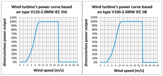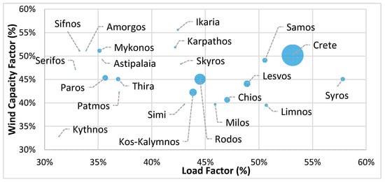 Greek autonomous electrical systems were classified by their peak demand to 8 “micro” systems—with less than 1 MW maximum demand (Megisti, Anafi, Ag.Efstratios, Othonoi, Erikousa, Donousa, Agathonisi, Anikithira), to 11 “small” of MW-scale—up to 10 MW (Karpathos, Ikaria, Simi, Skyros, Sifnos, Serifos, Patmos, Milos, Kythnos, Astypalaia, Amorgos), to 9 “medium” of the ten-MW-scale (Chios, Syros, Paros, Myconos, Lemnos, Lesvos, Samos, Kos-Kalymnos, Thira) and to 2 “large” systems, Rodos and Crete, with a peak demand of more than 100 MW (195 MW and 645 MW, respectively). In Figure 3, Greek islands with more than a 1 MW peak were classified by their load factor and wind potential. Load factor was defined as the ratio of the annual average by the annual peak load demand of the island. For the wind potential assessment on each island, the wind capacity factor was calculated given the analytical mesoscale wind data hourly timeseries at 50 m height of the typical meteorological wind year [19] and using commercial indicative wind turbine power curves. More specifically, the selection of the class of wind turbine was based on the average wind speed of each island. The Vestas V100-2.0 MW IEC IIB was used for an average wind speed of 7.5–10 m/s, and type V110-2.0 MW IEC IIIA, for lower wind potential cases with an average wind speed of 6–7.5 m/s. The dimensionless power curves used on the calculations are presented in Figure 4.