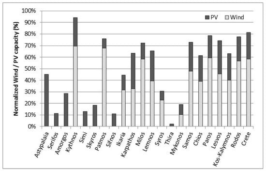 Normalized wind and photovoltaic solar energy (PV) capacity by the annual mean load in non-interconnected Greek islands.