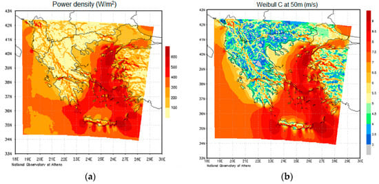 High resolution wind atlas based on typical wind year (a) power density (W/m2) [19], (b) parameter c of Weibull distribution.