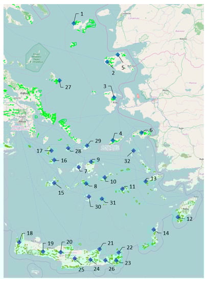 The selection of 32 representative points in the Aegean Archipelago was based on the location of wind farms, as per the interest of the investors, and it is depicted in the RAE’s geographical information system of wind farms application in the Greek territory (Figure 8). The specific number of selected points depended on the size of each island and the spatial dispersion of wind farms. As a result, one point was used in smaller islands, two points in medium islands (i.e., Lesvos), three points in a group of islands with a local interconnection (i.e., Paros–Naxos) and nine points in Crete. The details of the selected 32 points data are presented in Table 6. The target of this approach was to define one timeseries of aggregated wind power output representative for each island or group of islands to be used for the identification of N different situations of wind power production. By this way, the correlation between different locations which host wind farms was taken into consideration. For example, in Crete, 9 simultaneous hourly timeseries of wind velocity were used to develop the probability distribution of the aggregated wind power output in the islands. The wind installed capacity under examination was considered to be split equivalently into the 9 points.