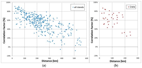 Correlation factor of wind velocity versus distance: (a) among 32 points (all islands), (b) among 9 points (only Crete island).
