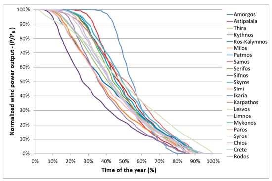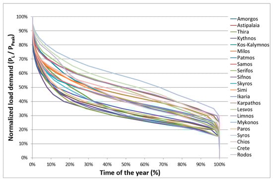 For the consideration of load demand, actual time-series data of the non-interconnected power systems were used (PPC data). The duration curves of normalized power load demand are presented in Figure 12. In order to present comparable duration curves, the normalized power demand PL/PPeak was used, where PL was the load power demand and PPeak was the annual peak demand in each island (presented in Table 3).