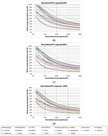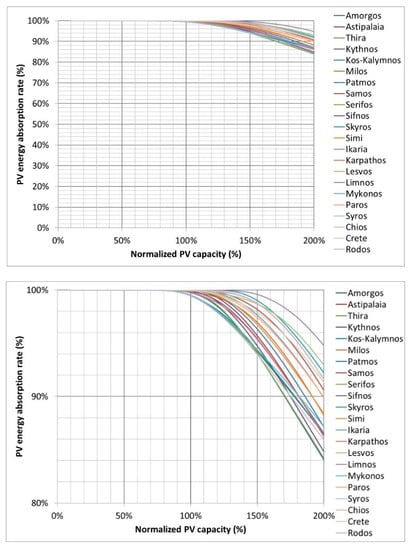 In Figure 14, PV energy absorption rate is presented for all the examined islands. It is presented to emphasize that high PV absorption rate occurred even for high PV integration. These results are valid for any wind capacity, underlying that wind installed capacity does not affect PV absorption rate. Given the specific profile of load demand and PV power output, for normalized PV capacity up to 110%, the absorption rate was 100% in all the examined cases. This happened, especially due to the fact that there was a seasonal and diurnal positive correlation between PV power output and load demand. For higher PV capacity i.e., 150% of the annual mean load, the absorption rate was still higher than 94%.