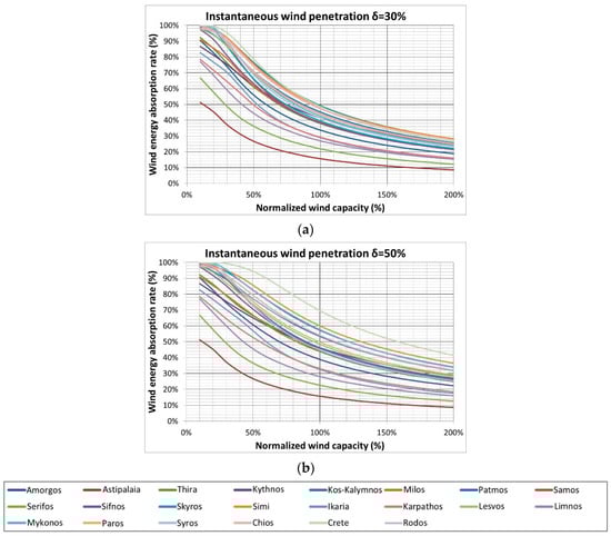 Wind energy absorption rate for different instantaneous wind penetration δ: (a) 30%, (b) 50% (without PV capacity).