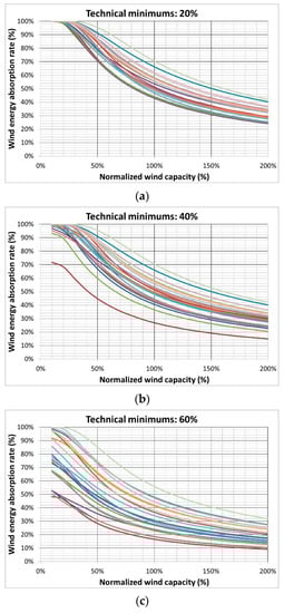 Wind energy absorption rate for different technical minimums TM: (a) 20%, (b) 40%, (c) 60% (without PV capacity).