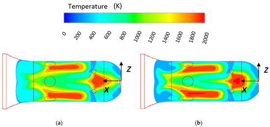 The net effect of the intensive swirling eddies and the CRZs is a widening of the high-temperature zone in the main flame region of the combustor, as shown in Figure 4. The increased quantity of eddies resolved by the SSTKWSAS model act to prevent the high-temperature zone, predicted by the SSTKW model, from penetrating from the secondary region back into the primary region of the combustor. To the author’s knowledge, such phenomena have not previously been highlighted because most researchers have preferred to focus only on simplified burners, with no sufficient important features of a practical gas turbine combustor, such as the primary and secondary holes. The penetrating flame predicted by the SSTK model does not only change the wall temperature distribution in the secondary region of the combustor, but also changes the hot fluid flow at the nozzle exit (the outlet of the combustor). This finding is believed to be important for turbine designers, though no detailed comparisons with experimental data are provided in the present study due to insufficient information about the geometric shape of the transition nozzle.