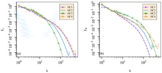 Kinetic energy spectrum (a) and thermal energy spectrum (b) for simulations HC1, HC2, HC3, and HC4.